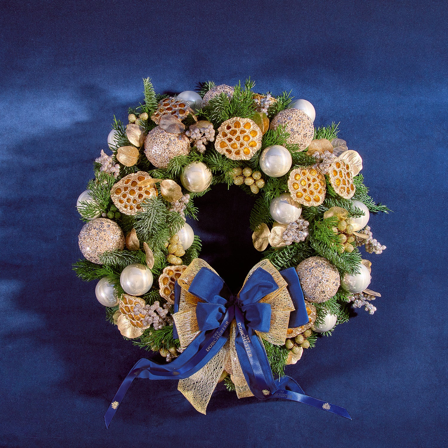 Adorn your door with our magnificent handmade wreath. Evergreen pine sprigs are embellished with golden, glittering festive decorations and tied up with a royal blue ribbon, for the finest festive welcome.