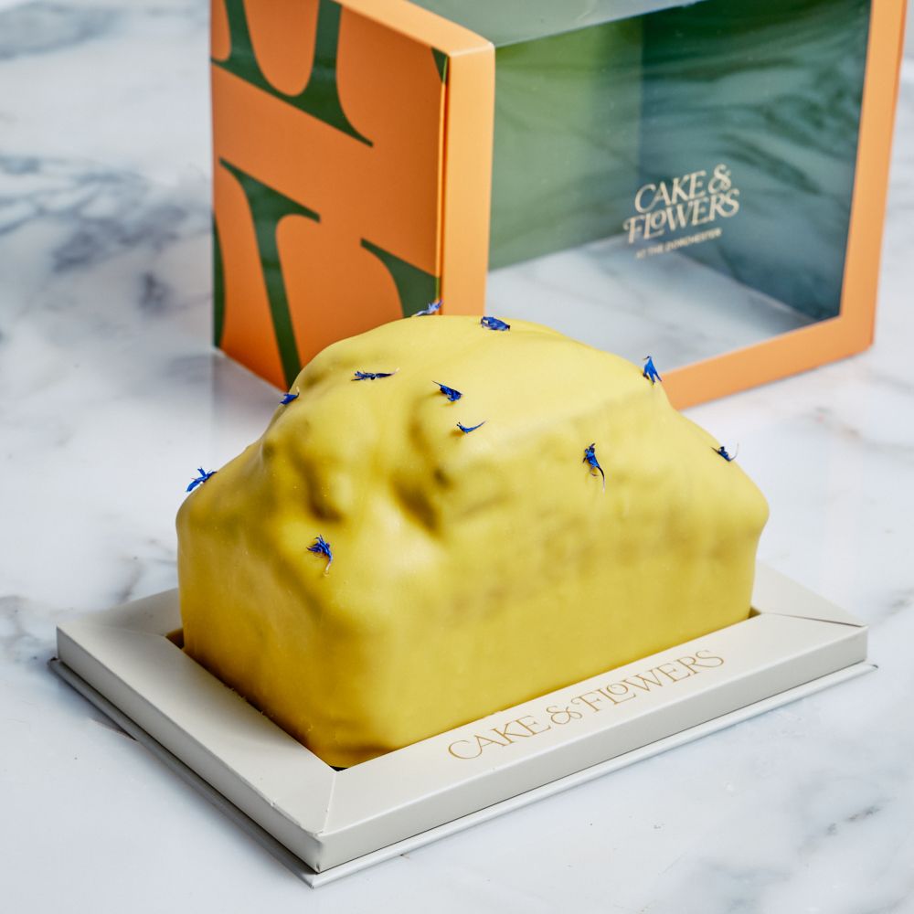 Lemon and Earl Grey cake with yuzu syrup wrapped in bergamot glaze.